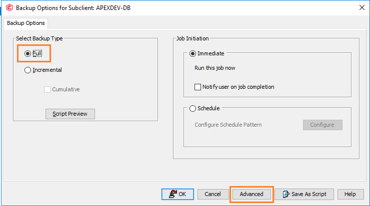 On “Backup Options” page, select “Full” and click on “Advanced” button.