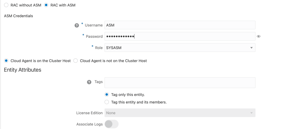 Provide ASM credentials and choose appropriate entity attributes. Enabling “Associate Logs” will enable the database for Log Analytics.