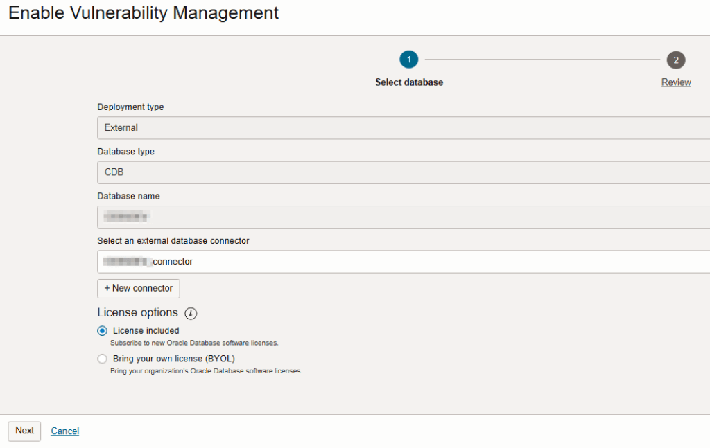 Note: If you have discovered a database as part of Stack Monitoring, these steps are already performed and you should see the discovered database under “Managed Databases” with Status “Connected”. You should directly go to “Enable Vulnerability Detection”.